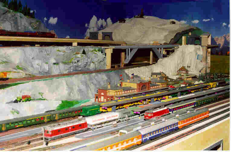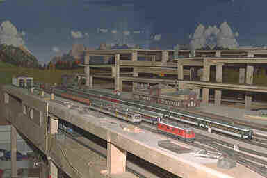 Die Anlage umfasst ca. 120m Gleis, 30 Weichen und viele Signale. Der "grosse" Bahnhof hat 6 Durchfahrtsgeleise, ein Lokdepot für 6 Lokomotiven und mehrere Abstellgeleise. Baubeginn war im August 1996. Als erstes wurde der Hintergrund montiert. Danach habe ich den Holzrahmen erstellt.