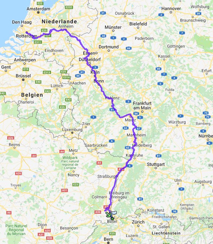 Achte Etappe: Am morgen als ich erwachte war strahlend blauen Himmel. Kaum aus der Stadt musste ich eine Fähre nehmen. Danach habe ich mich wieder kurz verfahren. Dank Navi fand ich auf meine Route zurück. Es gab immer mehr Wolken und plötzlich kam ich in ein Gewitter. Zum Glück fand ich bei einer Tankstelle Unterstand. Nach 20 Minuten konnte ich weiter fahren und schon bald zeigte sich die Sonne wieder. Es gab mehrere Umleitungen was mit dem Velo nicht immer einfach war da der nicht ausgeschildert war. Heute hatte ich auch viel Gegenwind was mir aber lieber als Regen war. Mehrmals hatte ich noch eine Fährverbindung. Ich staunte auch dass ich so schnell in Rotterdam war. Es war ein schöner Glücksmoment als ich nach 1055km in die Stadt fuhr und mein Ziel erreicht habe.