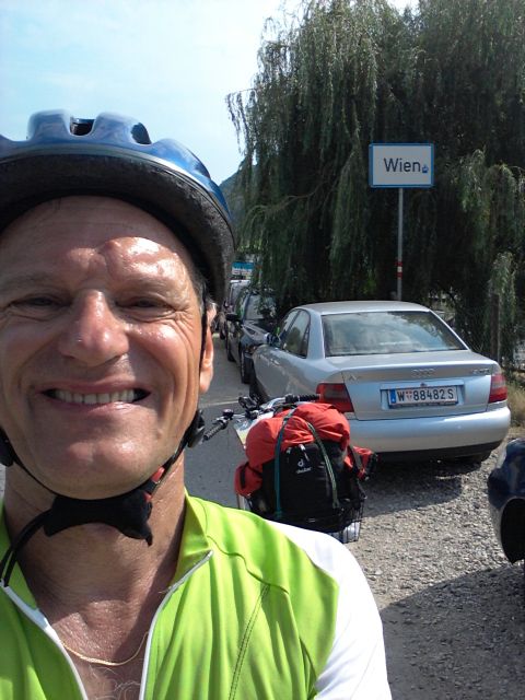 Die letzten 20km waren Landschaftlich nicht besonders interes-sant. Dafür sah ich von weitem mein Ziel "Wien". Nach weiteren 120km erreichte ich die Donau-Metropole. Nach insgesamt 515 Kilometern legte ich hier einen Rasttag ein. Da ich schon mehrere Male in Wien war kam ich ohne Stadtplan zurecht. Meine Tour führte mich weiter ins Burgenland wo ich meine Verwandten besuchte. Dank Navi das mich bestens durch die Stadt führte habe ich Wien nach 2 Stunden hinter mir gelassen. Nun ging es nicht mehr nur Abwärts. Über das Rosaliengebirge erreichte ich nach dem Tagesrekort von 140km Stadt-Schlaining. Nach einem weiteren Rasttag fuhr ich weiter durch das Südburgenland und erreichte nach die Steiermark. Gegen Abend kam ich nach weiteren 85km in Feldbach an. Ein freundlicher Bekanntenbesuch rundete meine Reise ab. Mein Endziel Graz wurde durch eine Zugsfahrt erreicht da es immer wieder regnete. Ich wollte kein Risiko nach dieser schönen Tour eingehen. Total bin ich ca 750km in 10 Tagen geradelt. Der Zug von Graz über München brachte mich nach Winterthur zurück.
