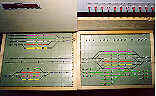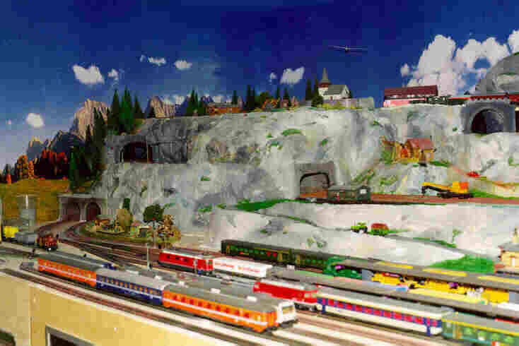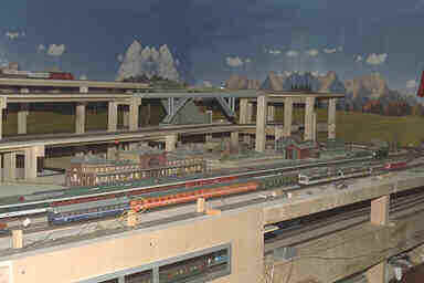 Die Anlage umfasst ca. 120m Gleis, 30 Weichen und viele Signale. Der "grosse" Bahnhof hat 6 Durchfahrtsgeleise, ein Lokdepot für 6 Lokomotiven und mehrere Abstellgeleise. Baubeginn war im August 1996. Als erstes wurde der Hintergrund montiert. Danach habe ich den Holzrahmen erstellt.