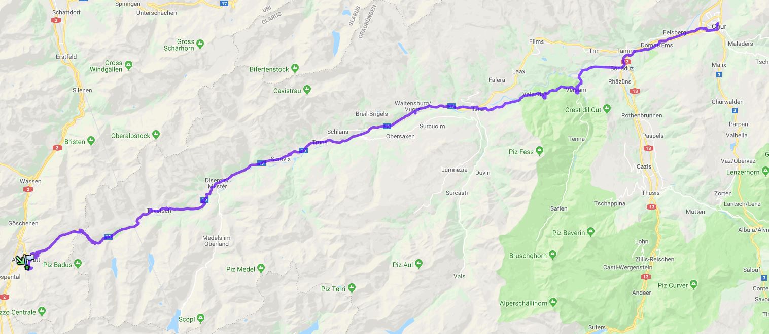 Velotour über den Operalppass Andermatt (1'447m.ü.M.) - Operalppass (2046 m.ü.M.) - Diesentis - Ilanz (702 m.ü.M.) - Versam (909m.ü.M.) - Chur (593m.ü.M.) 100Km in 4:50 Std. Total 1024 Höhenmeter